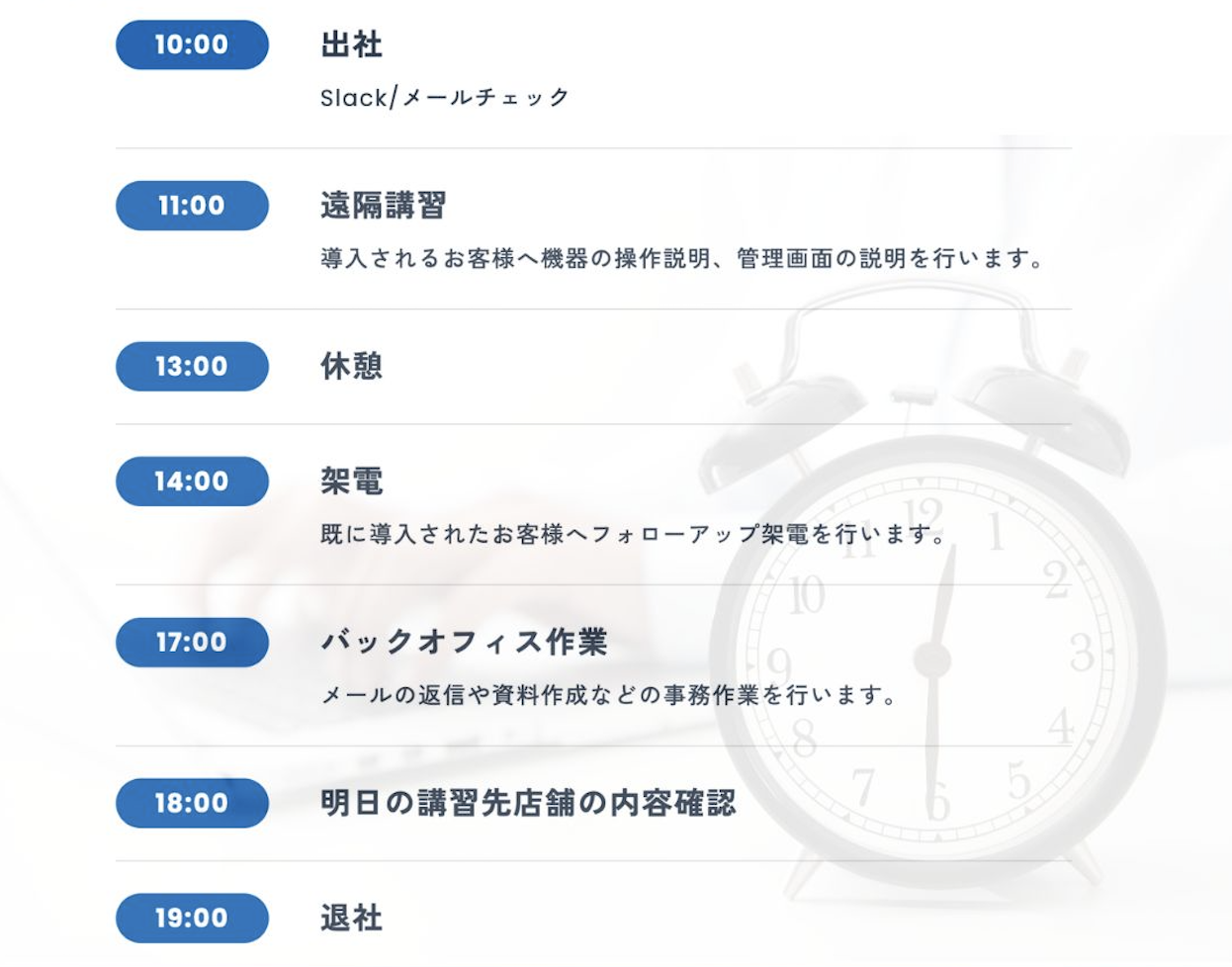 POSレジの導入を決めていただいたお客様のスケジュール調整やレジに反映させるメニューの打ち合わせ、機器の取り付け、導入店舗の経営者様とアルバイトの方々への機器の使用方法の説明などを行っております。