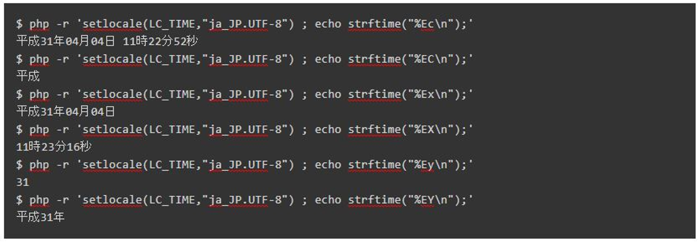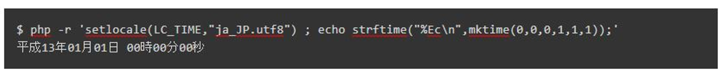 ポイントは setlocale()2 関数でロケールを日本に設定して、strftime()3 関数で書式指定して出力しています。その時に書式指定として "%E" 修飾子を追加することで和暦の年号が出力されています。