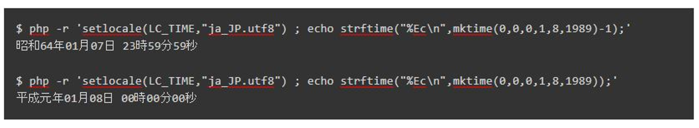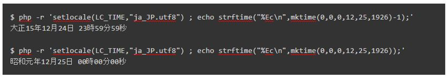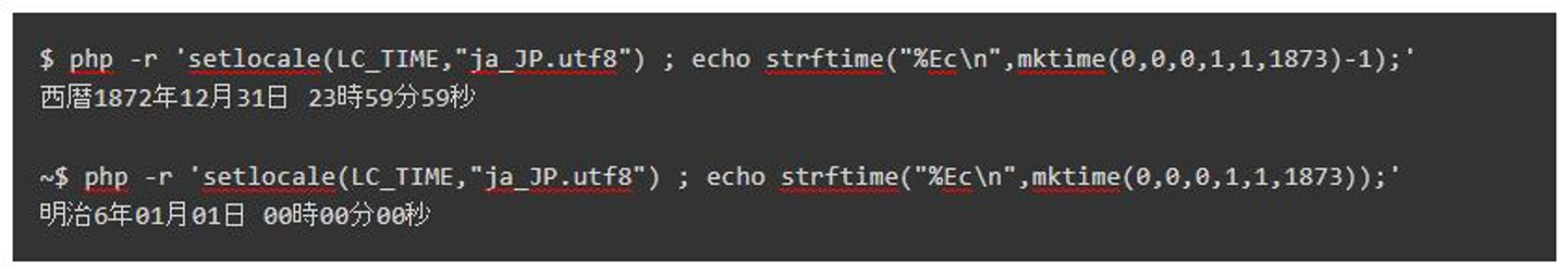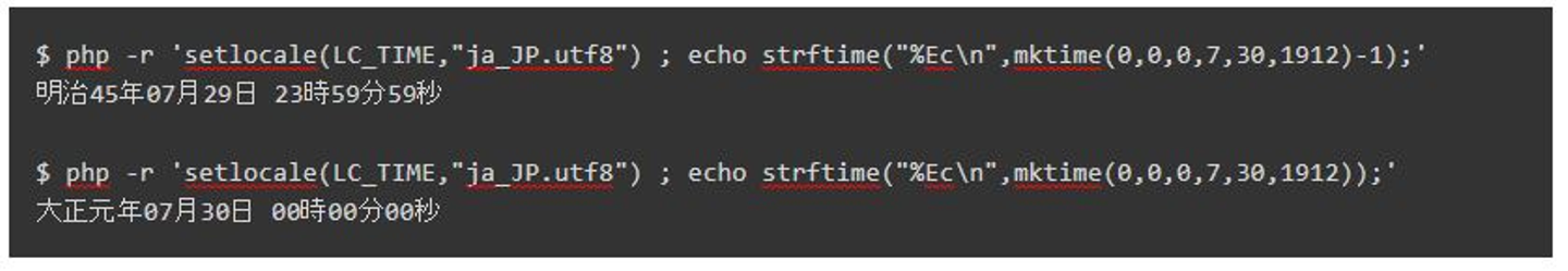 さていくつかの境界事例を見てみましょう。strftime() 関数は、日付時刻の指定に UNIX タイムを利用するので、ここでは mktime()4 関数を利用しています。