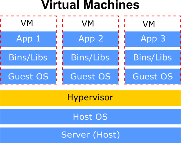 アプリケーションやモジュールの競合問題を解決するために採用されるようになったのが、仮想マシン(Virtual Machines)です。仮想マシンは、1台のサーバ上に複数の仮想的なサーバ(ゲストマシン)を構築する技術です。