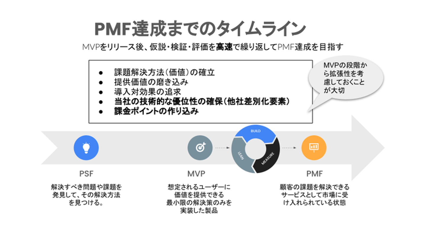 「これは世の中の役に立つかもしれない」と仮説を立て、まずはプロトタイプを作り、ユーザーにフィードバックをもらう。反応が良ければ機能を足していって、プロダクトマーケットフィット(PMF)を目指す。期待する結果に達さなければ、市場の動向を見ながらクローズも検討する。