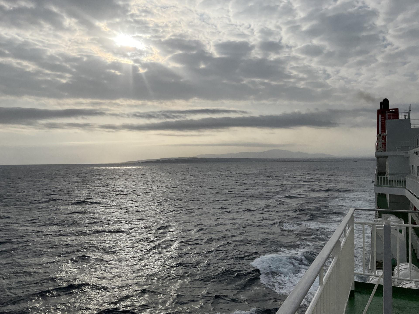 八戸の館鼻岸壁朝市というのを観光していたのですが、そのまま仙台に帰ったら物足りないと感じたので、近くのフェリーターミナルでチケットを買い、そのままフェリーに乗って苫小牧に行きました。フェリーの中でホテルなどを予約して、本来の仙台↔八戸の1泊旅をその場の気分で仙台→八戸→苫小牧→帯広→札幌→苫小牧→仙台の3泊(+苫小牧~仙台のフェリー上の1泊)旅しました。下の写真はフェリーの中でホテルを予約したあと、甲板に行って、「綺麗だな~」と思って撮ったものです。