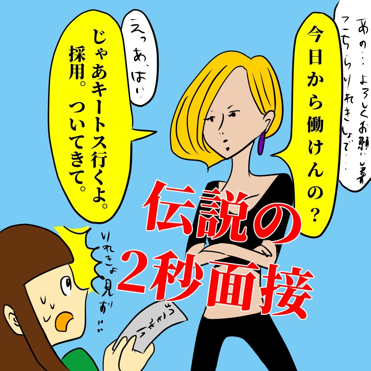 奈苗 で、面接日。ゴールデン街近くの待ち合わせ場所で待っていたら緑道からかなり長身の全身黒尽くめで少し不機嫌そうな女性がやってきまして、めっちゃ歌舞伎町怖いなと思ってたら、それがアヤコさんで。ぶっきらぼうに挨拶され、当時のブライアンバーに連れていかれ、履歴書お渡ししたら一瞥もせず「今日から働けんの?」と聞かれそのまま、歌舞伎町のkiitosという系列店に連れていかれ働くことになりました。面接は体感2秒でしたね。