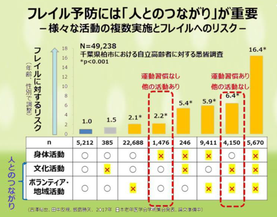 逆に運動をしていなくても文化活動やボランティアなど「人とのつながり」を積極的に行っている人の方がフレイルになりにくいという結果が出ているのです🤝