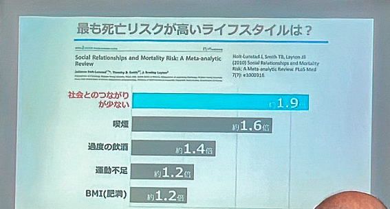 下から肥満や運動不足、飲みすぎ、喫煙…と続き一番上の、死亡リスクが高いとされるのが「社会とのつながりがない」ことなんです😲‼️