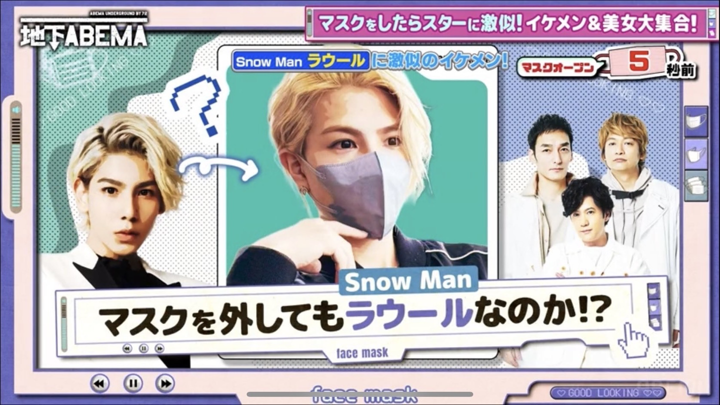 FERSEN 空条承太郎 が7/6(日)に「ななにー 地下ABEMA」で放送された『マスクイケメン&美女大集合SP』に、Snow Manのラウールさん似として出演しました!📺
