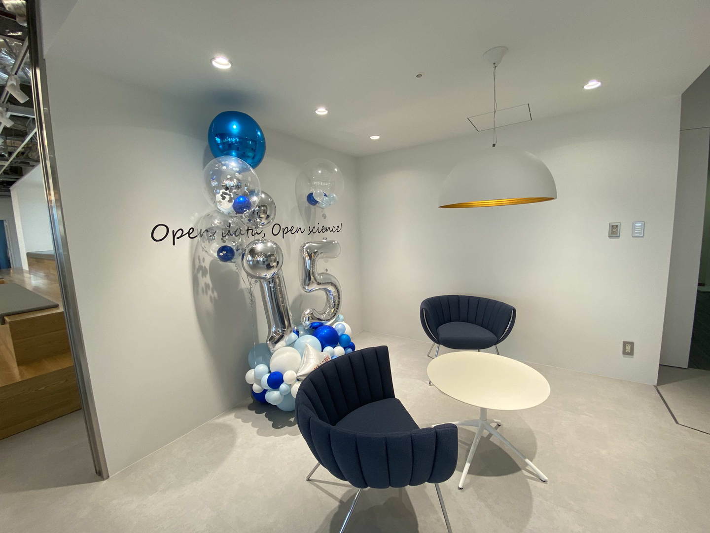 オフィスの顔ともいえる、パブリックエリア。店舗のカウンターのような設えと、オープンな打ち合わせテーブルがずらり。そして、憧れの雛壇まであります。