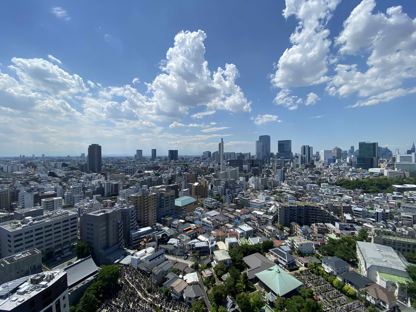 窓からはトーキョー・コンクリートジャングルを一望できます。眼下にはお墓も広がっています。都心の一等地にこの広さ、立派だ。
