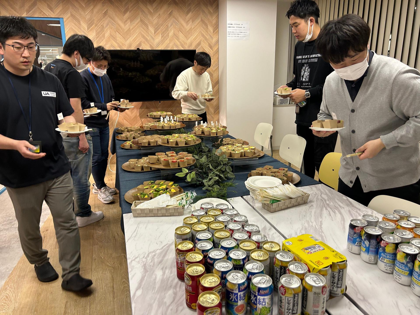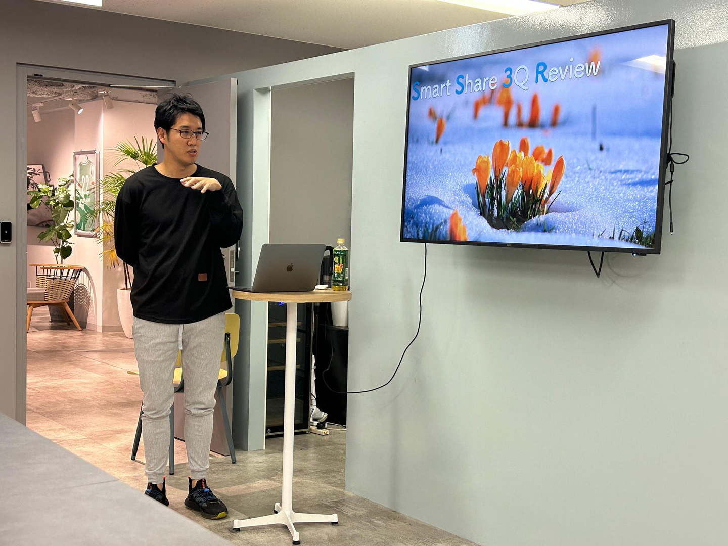スマートシェアでは四半期毎に報告会を実施しています。約1時間の報告会後、毎回懇親会を行い、コミュニケーションの場にも役立てています。オフライン・オンライン共に開催しますが、この日は出社する人も多いです。