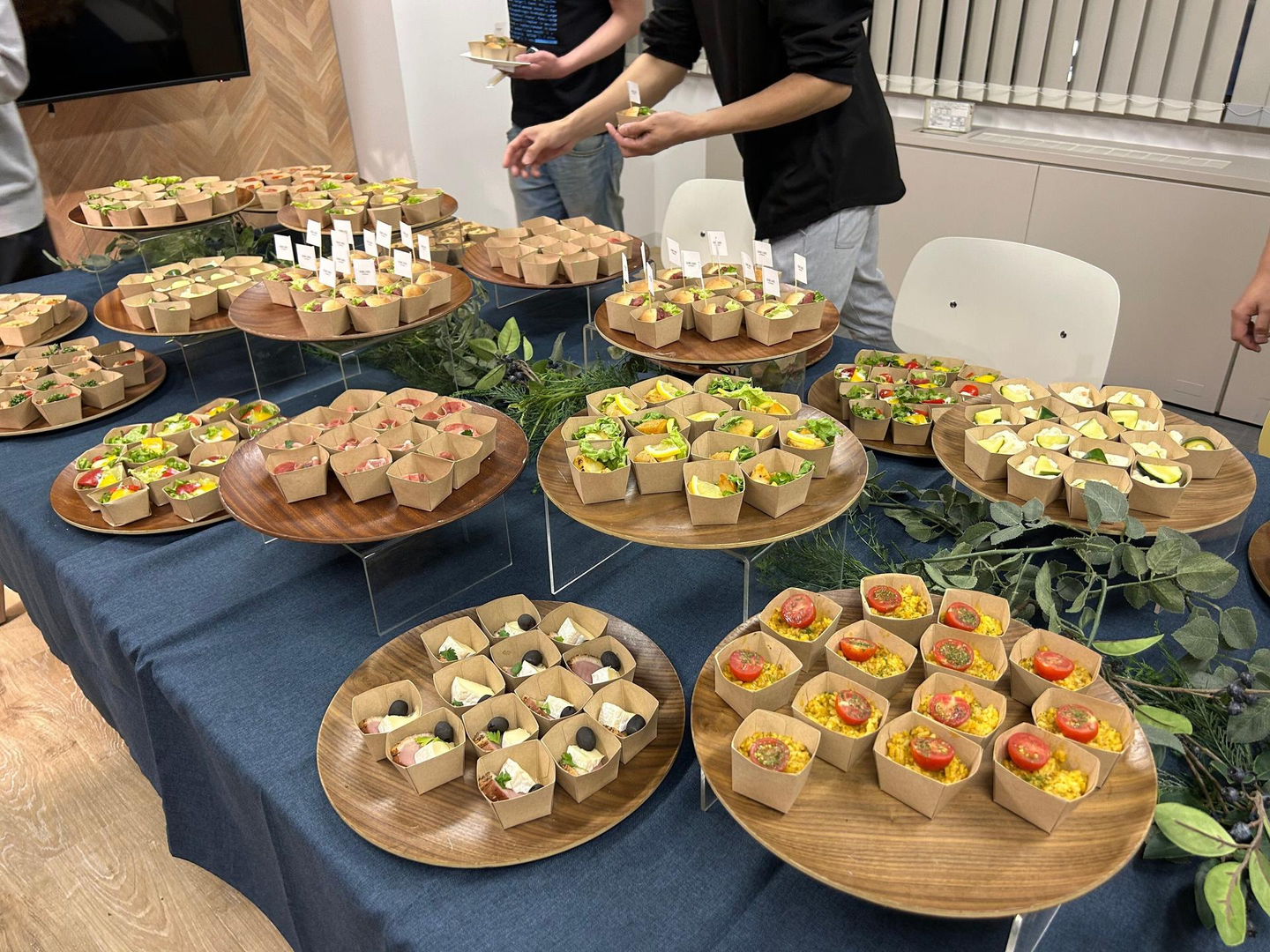 「入社してよかった」と思える活動を計画するチーム。社員アンケートでロゲイニングや哲学カフェなど、初めて聞くユニークなイベントも含めて希望をヒアリング。早速ケータリングが本報告会で採用されました!(今までは会社隣のLIFEに人事が買い出ししてくれてました。感謝。)