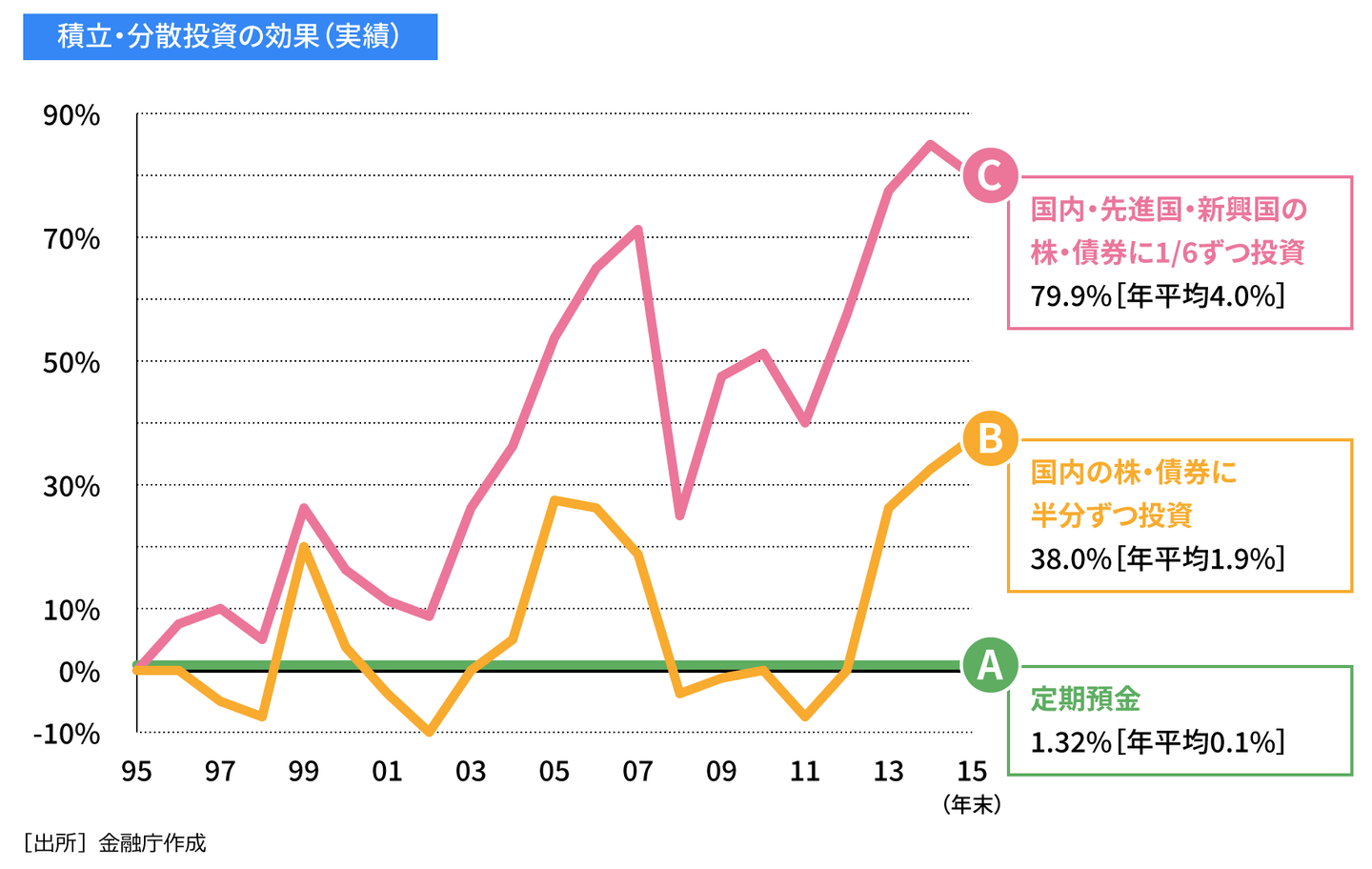 下記の図から、投資を始めて2年目で売却するよりも20年目で売却した方がリターンが大きいことが分かり「長期」の効果が窺えます。また、A・B・Cは金融商品の特徴によって変動幅も大きく異なります。リスク許容度に合わせて地域や金融商品を「分散」させる必要がありそうです。最後に「積立」は一括投資よりも取得単価を平準化できる仕組みです。必ずしも一括投資よりもリターンが大きくなるとは限りませんが、少額から始められる気軽さから初心者にオススメと言われている所以が分かりました。