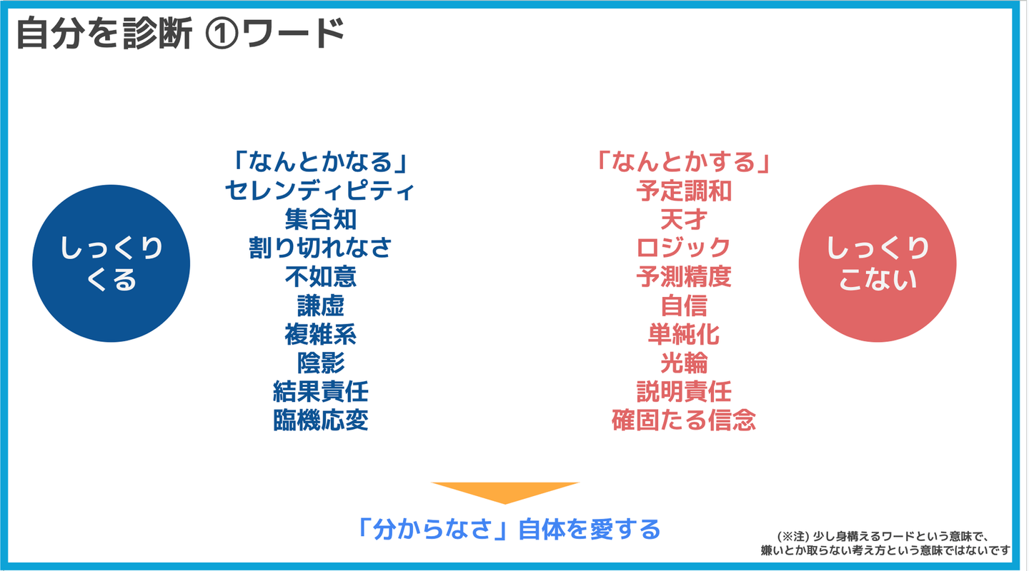 「しっくりくる」ワードと「しっくりこない」ワードで価値観を表現したもの。ここから、輪郭がぼやけている状態を好み、分からなさ自体を愛する傾向があると分析。