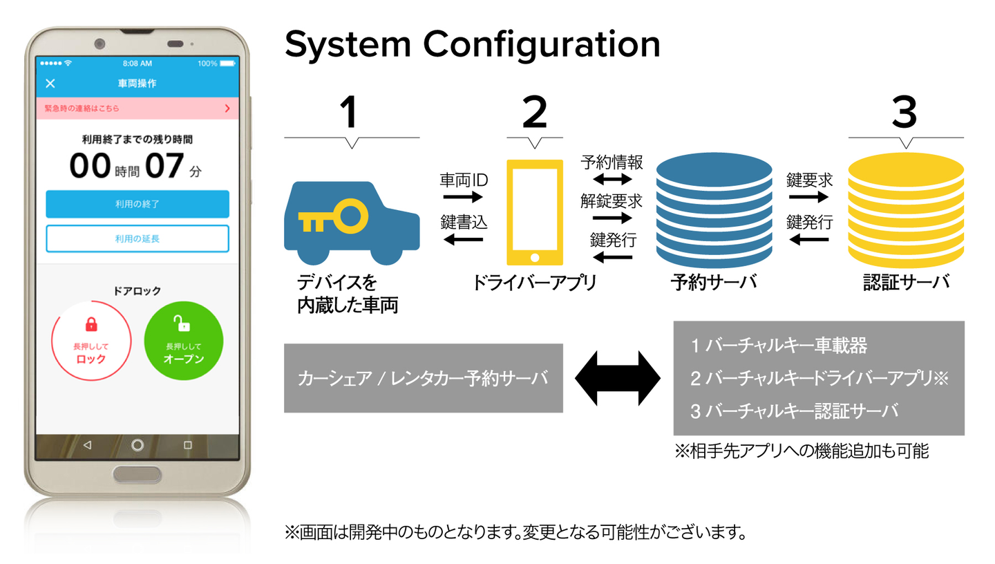 今回の「 バーチャルキー 」においては、「 任意の許可された相手だけに、許可された時間のみ 」、車両の鍵の権限を与えることができます。鍵の権限を与えられたスマートフォンから専用アプリでロックの施錠開錠を行うことができることで、個人間のカーシェアリングだけでなく、家族間での鍵の受け渡しや、共有化された社用車の鍵の受け渡しについても物理キーの受け渡しをすることなく、車両のシェアリングを実現します。