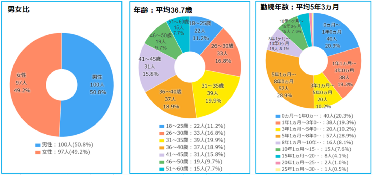 男女比率や年齢構成、職種比率など、どんな社員が多く働いているのか、