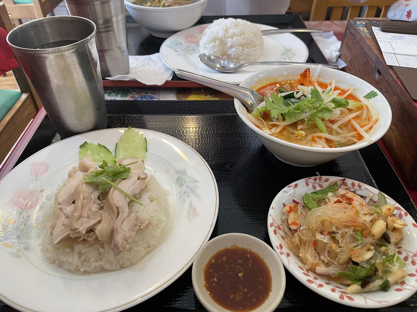 ランチメニューはとても豊富で、写真はカオマンガイとトムヤムラーメンのハーフ&ハーフセットです!