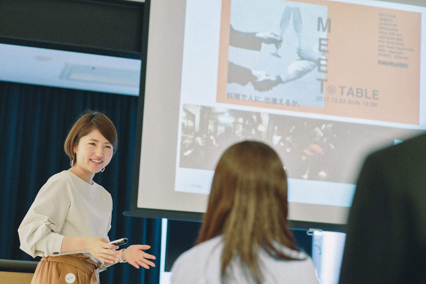 それぞれに緊張が多少ほぐれたところで、第一部がスタートしました。まずは会社の紹介から。スマイルズ代表取締役社長の遠山正道のことや、手掛ける仕事の特徴について、ひとつずつ丁寧に説明が始まります。中でも多くの時間が割かれたのが、今回の募集に関わるレストラン事業のこと。