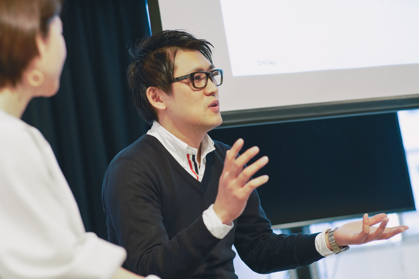 続けて「チェックイン」と題したアイスブレーク。あらかじめ用紙されていたポストイットに「どこから来たか」と「今回のイベントで聞きたいこと」を30秒で書き込み、隣にいる参加者と意見交換します。ほんの少し前まで他人だったのが、ちょっとした知り合いになれた気分。ときに笑いがこぼれ、それが会場の緊張した雰囲気を和ませます。