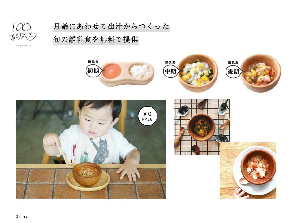 また、赤ちゃんをお連れのお客様には、離乳食を無償で提供。もちろんこちらも、他のメニューと同じく、1からシェフが調理しています。大人も、子供も、赤ちゃんだって。家族全員に「美味しい家族の思い出」を。そんな、本当の意味での「ファミリーレストラン」を目指しています。
