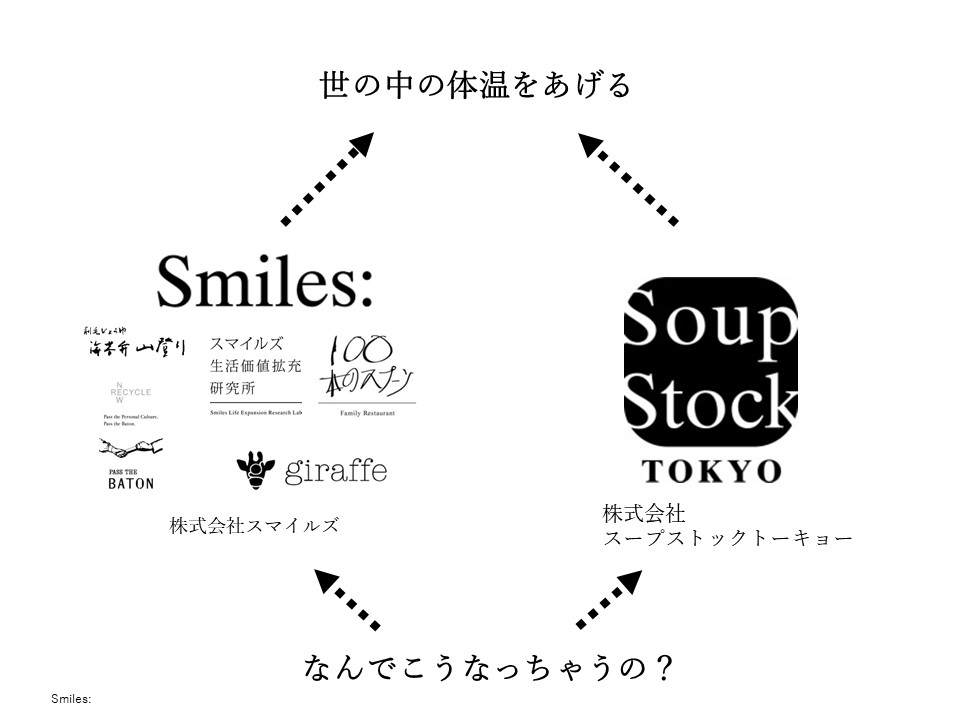 私たちスマイルズは、1999年に食べるスープの専門店「Soup Stock Tokyo」の1号店をオープンし、創業いたしました。“生活価値の拡充” という理念のもと、ネクタイ専門店「giraffe」やセレクトリサイクルショップ「PASS THE BATON」、ファミリーレストラン「100本のスプーン」、海苔弁専門店「刷毛じょうゆ 海苔弁 山登り」などあらゆる業態を展開し、既成概念にとらわれず新たな生活の在り方を提案しています。