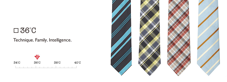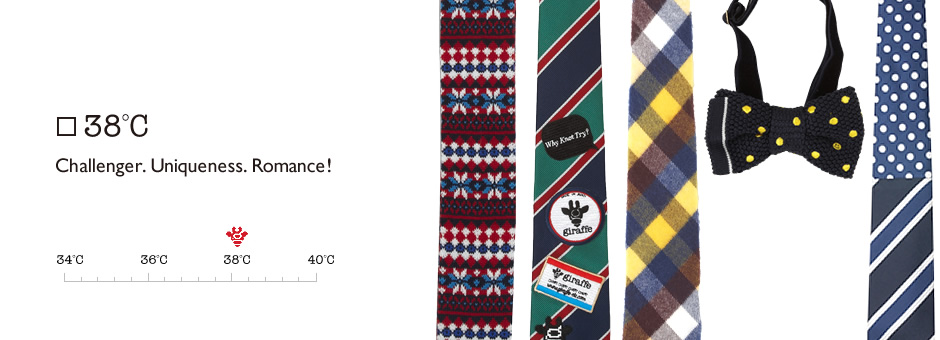 38℃:仕事の大事なプレゼン。緊張する相手とのちょっと豪華なディナー。なぜかパワーが湧いてこない日……。いつもより一歩前に踏み出したい時には、このネクタイを。(ブランドサイトより)