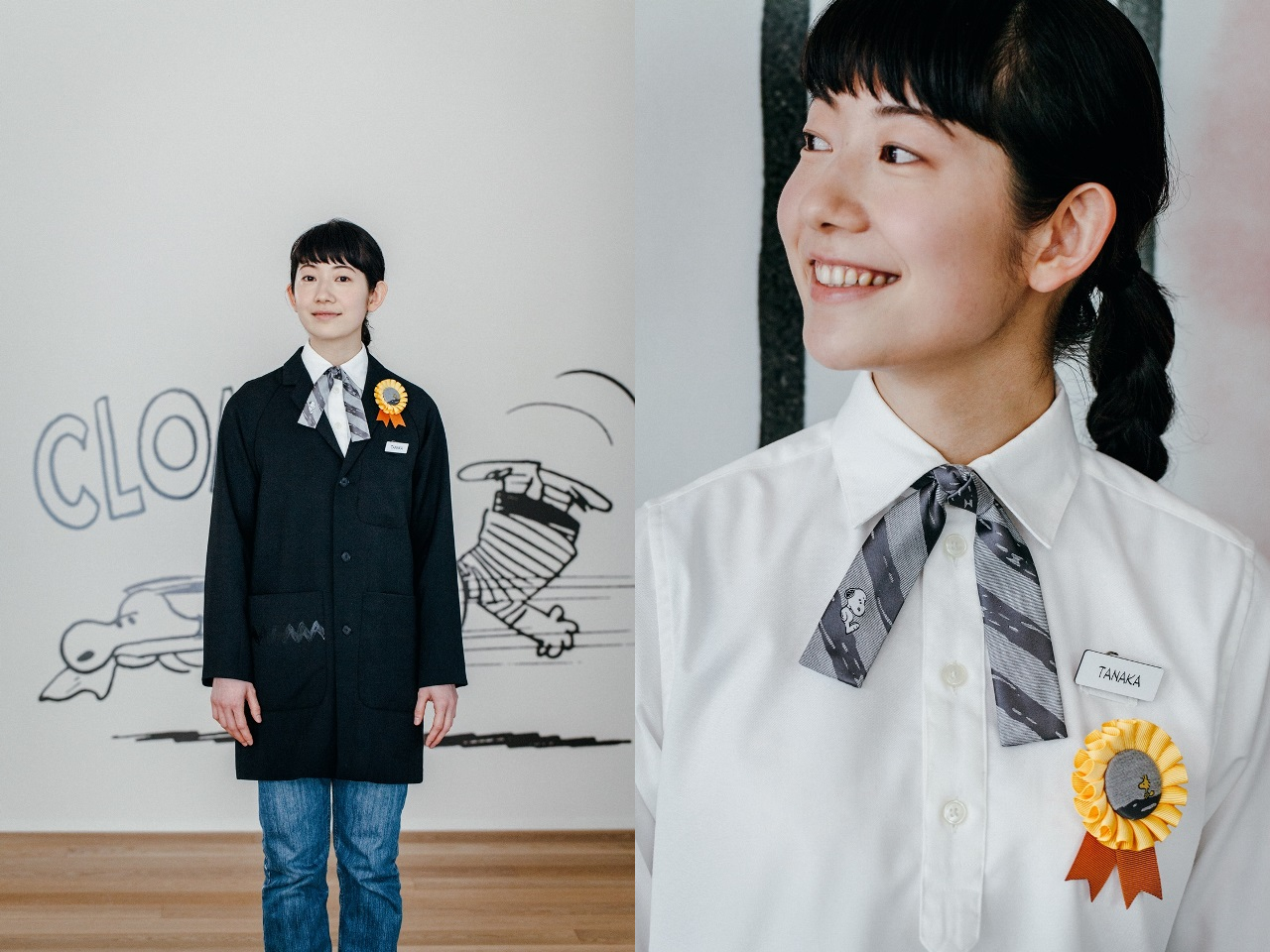 ネクタイが生んだ、新たな関係  ネクタイブランド「giraffe」は、様々な企業とコラボレーションを行っています。たとえば、こちら。2016年4月から2018年9月まで、東京・六本木にオープンしていた「スヌーピーミュージアム」のユニフォームを、私たちスマイルズが制作しました。アシンメトリーなデザインに、ストライプ柄とスヌーピーのイラストが織られています。もちろん、愛らしいスヌーピーの刺繍も。