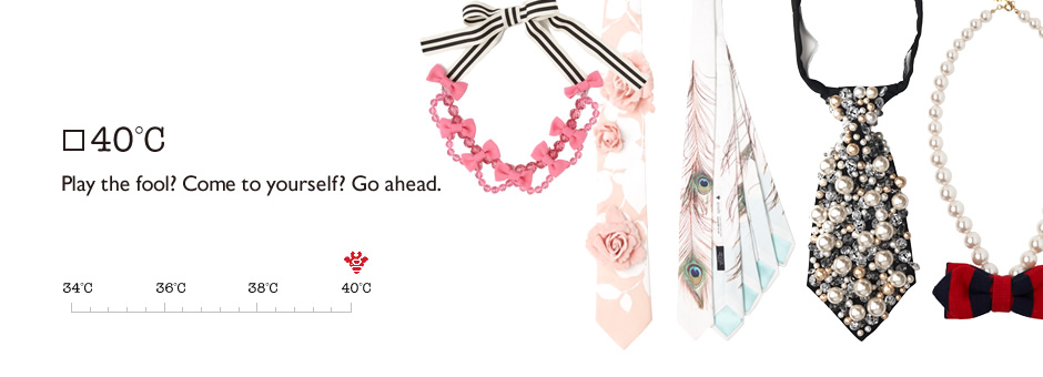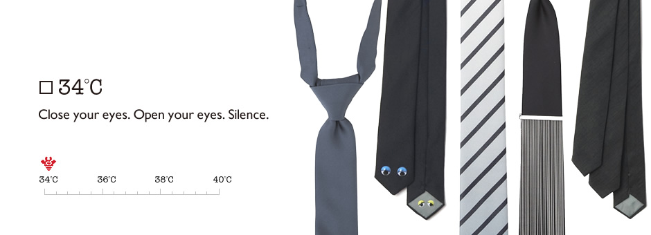 34℃:モードに、クールに、きめたい日ってありますよね。そんな日はこのネクタイたちを迷わずどうぞ。モード色使いのものや幅が細いナロータイなど都会的でクールなアイテムが揃います。(ブランドサイトより)