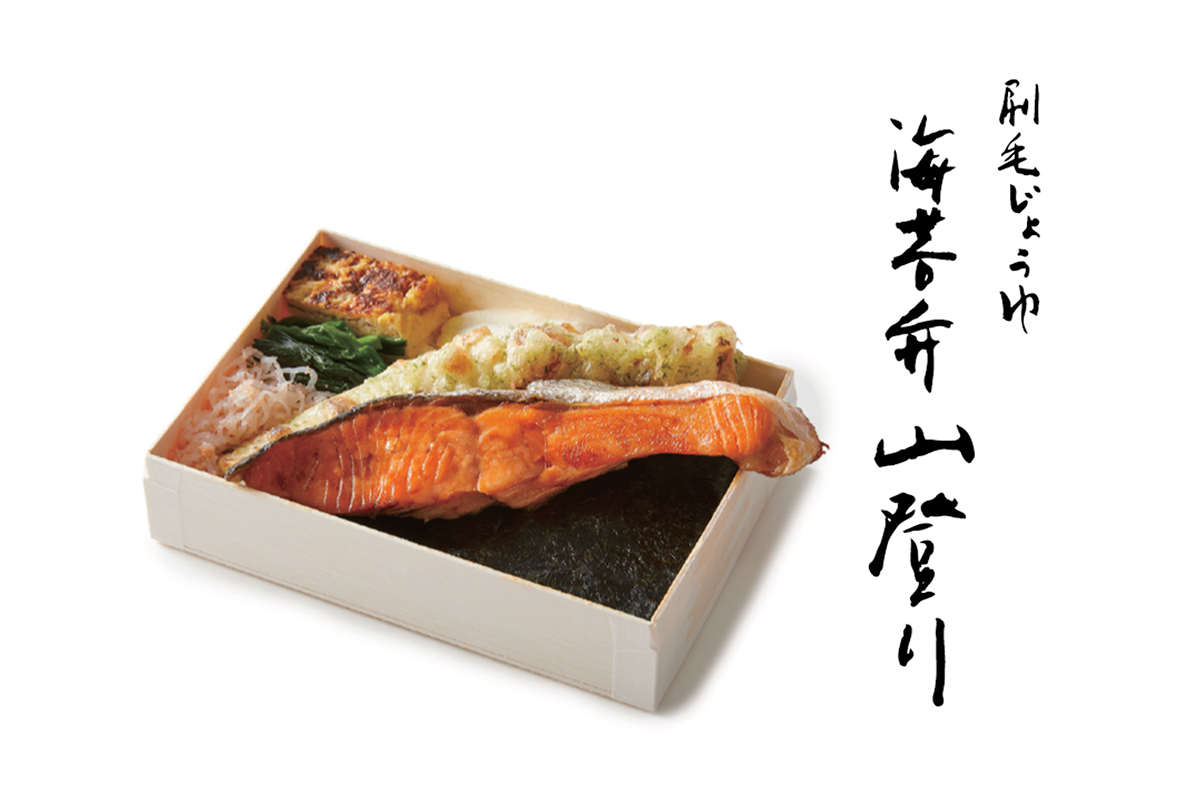 たとえば、こちら。築地から直接仕入れた鮭がどーんと乗った、「刷毛じょうゆ 海苔弁山登り」の人気弁当 『海苔弁 海(税込み¥1,080)』 。「鮭の塩焼き」や「ちくわの磯部揚げ」など、「海苔弁と言えばコレ!」といったおかずが並びます。