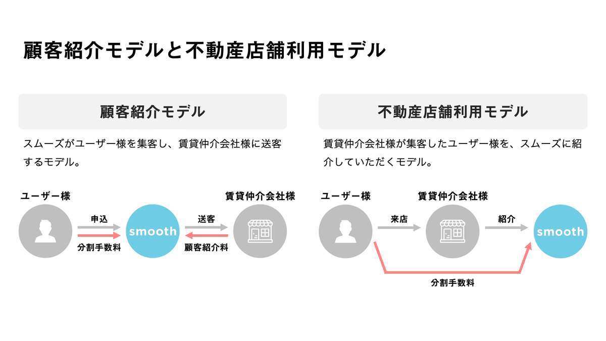 これは、部屋探しで不動産仲介会社様の窓口に来られたお客様に対して、不動産仲介会社様からスムーズのサービスを紹介していただくというものです。ユーザー様から分割手数料をいただいています。