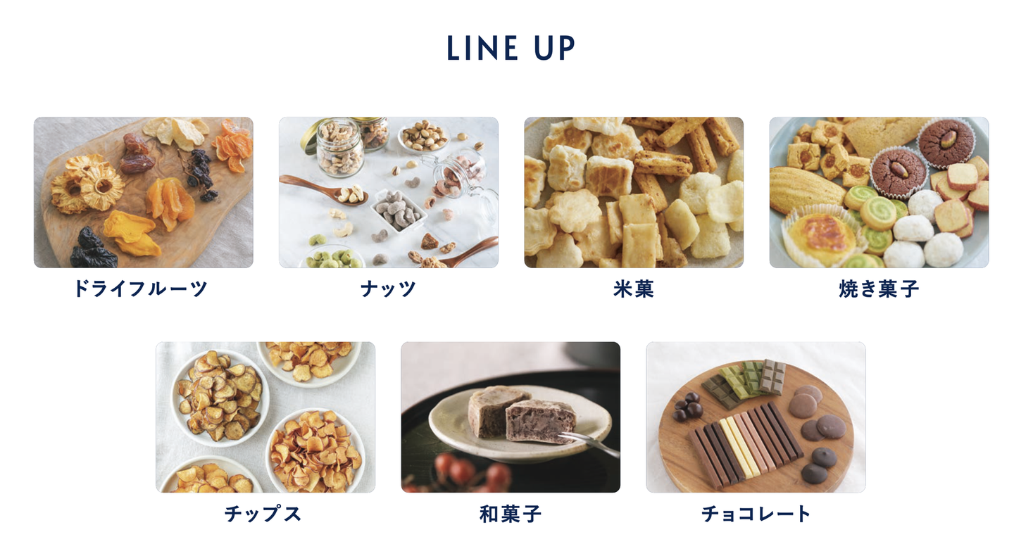 クッキーやフィナンシェ等の焼き菓子、ミルクや抹茶などのチョコレート、お煎餅などの米菓、パイナップルやレーズンなどのドライフルーツ、カシューナッツなどのナッツ、ポテトチップスやさつまいもチップスなどのチップス、きんつばやどら焼きなどの和菓子などなど・・・。