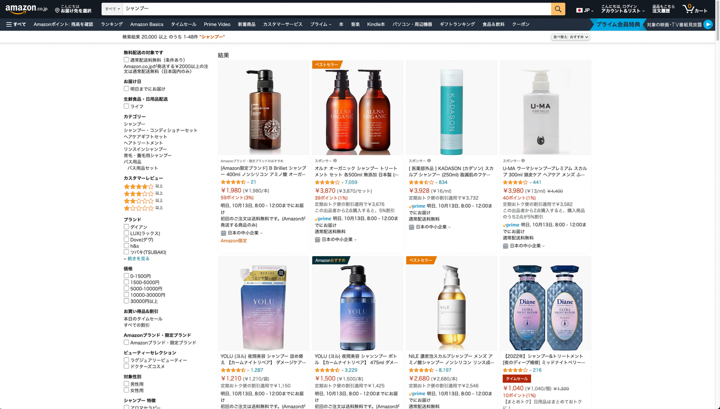 シャンプーと検索すると、ドラッグストアの棚とは違う商品が出てきます。
