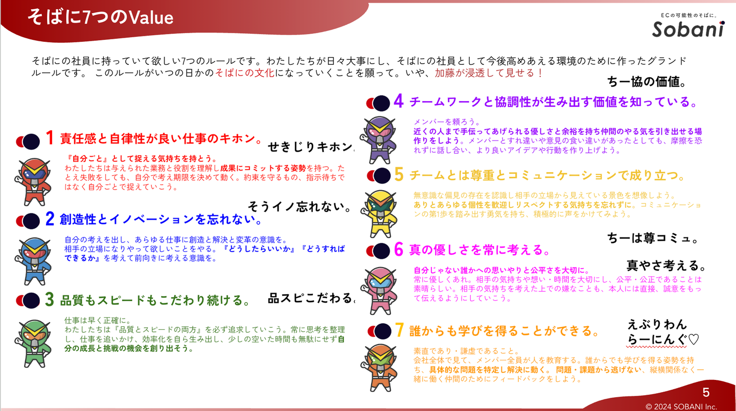 例えば、会社の7つのバリューが覚えやすくなるように、「そばにレンジャー」をつくったんです(笑)若手のメンバーにもわかりやすく、楽しみながら会社の文化を浸透させていく工夫をしています。