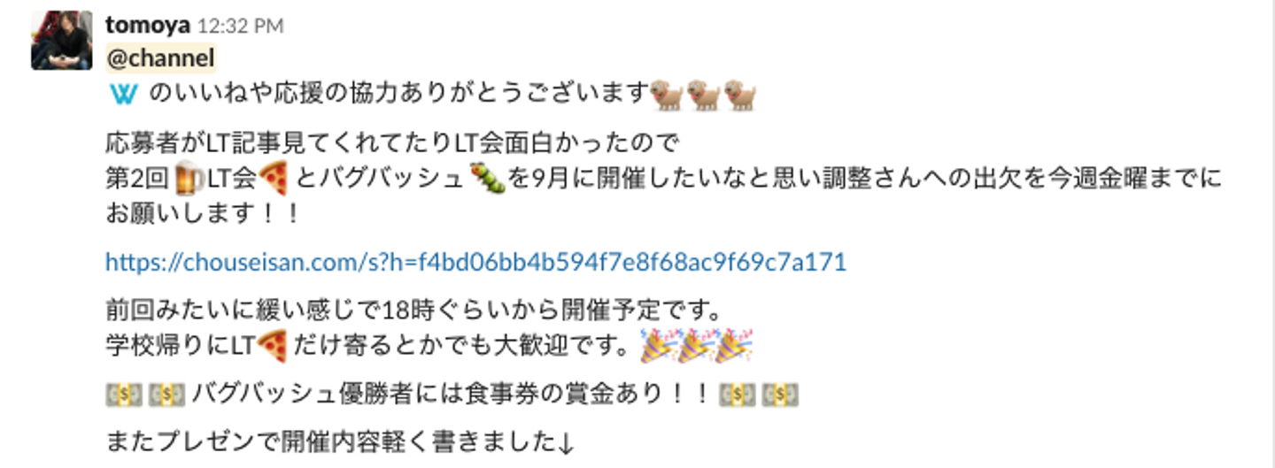 Slackで第2回LT会とバグバッシュ会を調整さんで招集