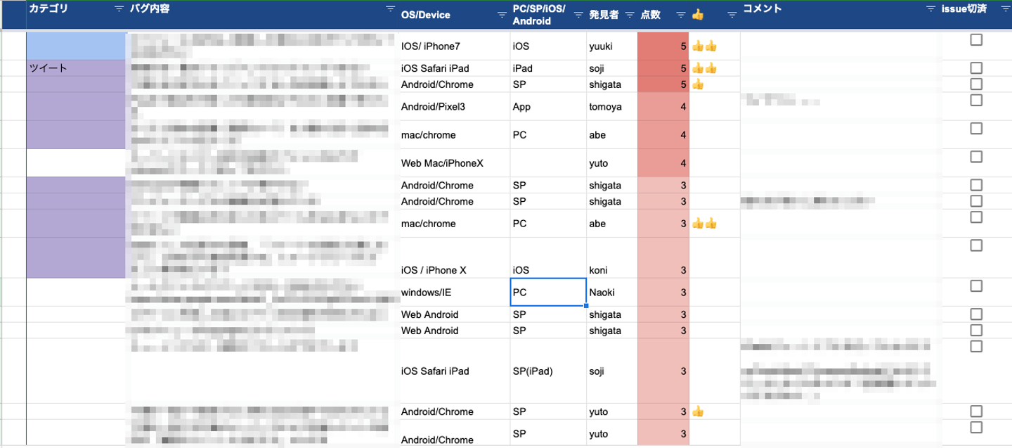 SocialDogではSlackに#kaizenチャンネルを作り日々サービスについての不満や改善点を思いついたら書き込むようにしているのですが、バグバッシュを行ってスプレッドシートに書き出す事でメンバーそれぞれの気にしてる箇所や、ユーザーの使いやすさを考えた起票など様々なSocialDogの改善点を改めて洗い出す事がワイワイ出来てよかったと思います!