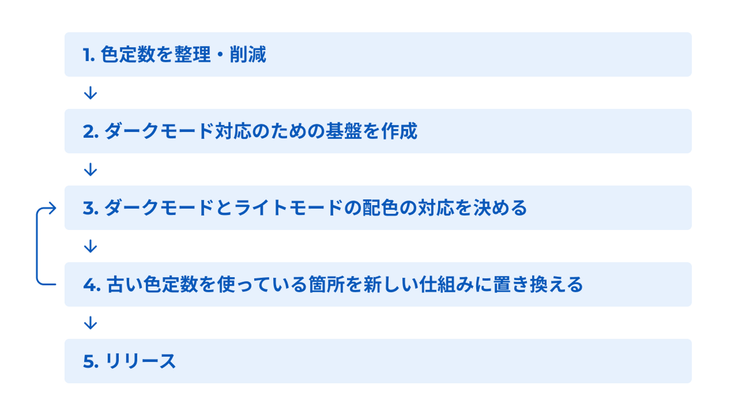 ダークモード対応を実施する以前は、上記で見てきたように「ダークモード対応前に使っている色=ライトモード時の色」が不必要に多く定義されている状態でした。これらの色1つ1つについてダークモード時の色を決めていくのは徒労です。