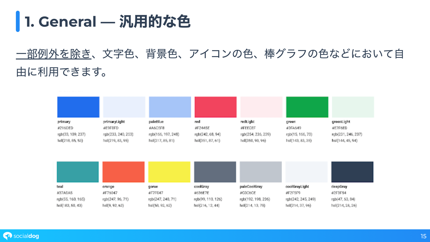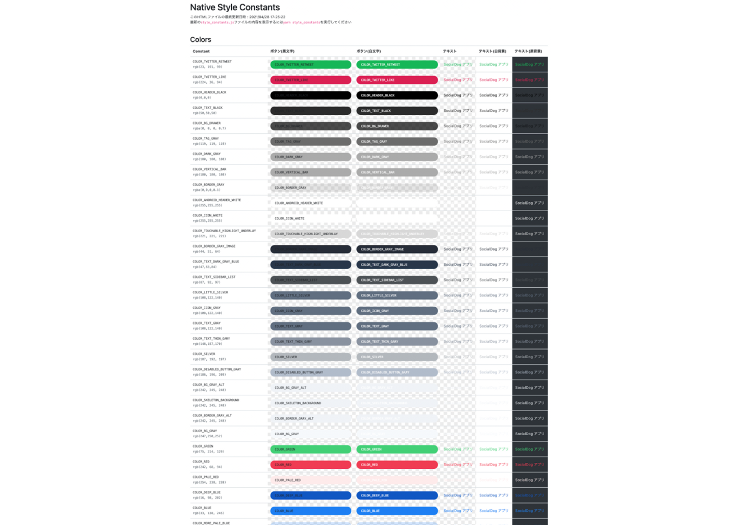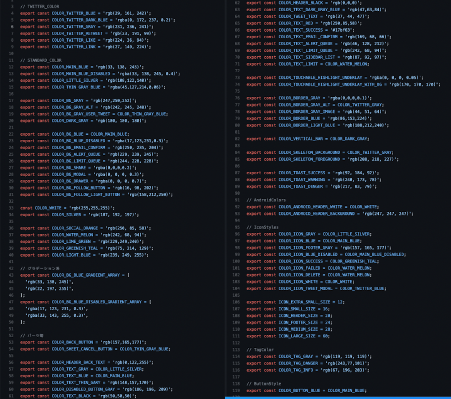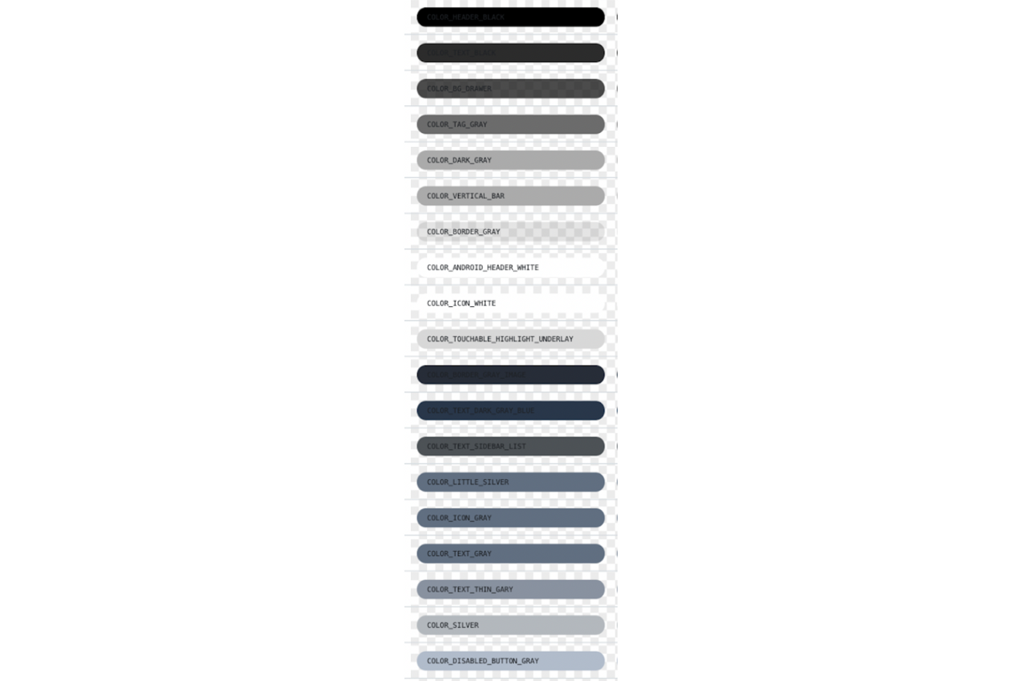 (アイコンフォントの色)のように、それぞれの色が使われるべき箇所が定数名で示されています。上記の画像を見ると COLOR_BG_ で始まる定数(背景色)、COLOR_TEXT_ (文字色)、COLOR_BORDER_ (ボーダー色)、COLOR_ICON_ (アイコンフォントの色)のように、それぞれの色が使われるべき箇所が定数名で示されています。
