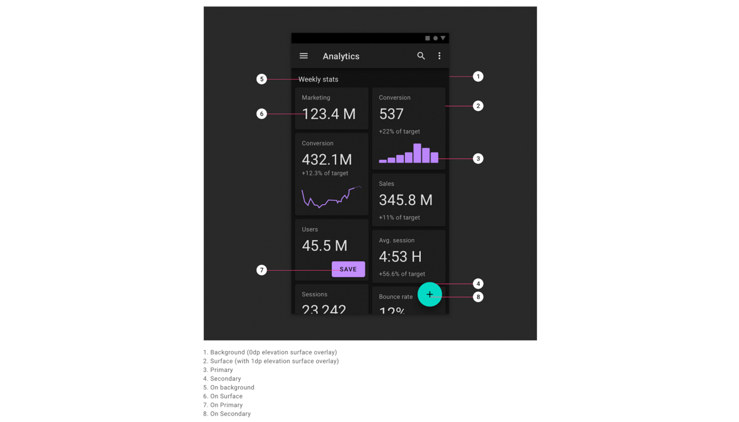 配色を決めるにあたり、主にマテリアルデザインにおけるダークテーマの考え方を大いに参考にしました。