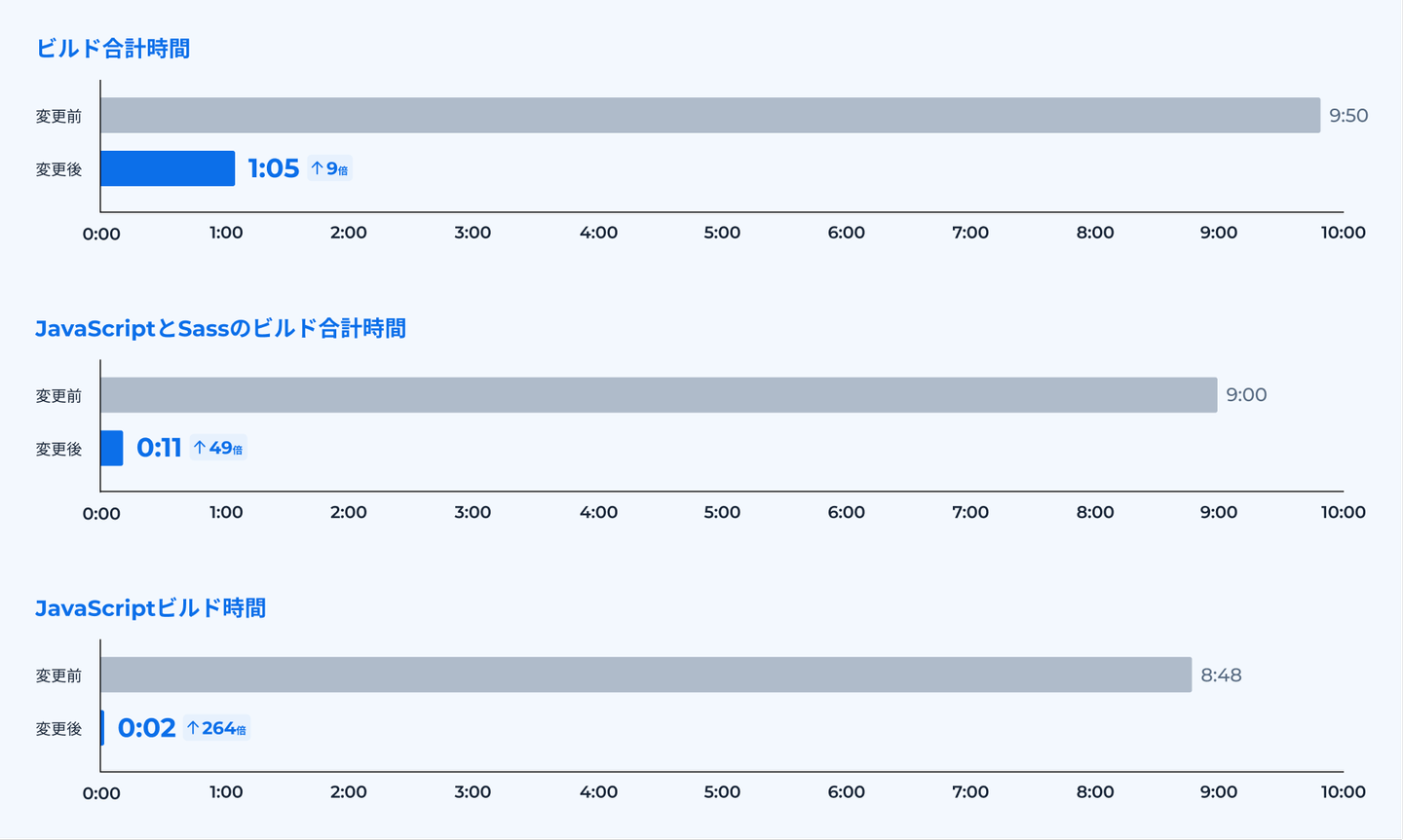 しかし、これらのデメリットとリスクを許容したとしてもビルドが8分から数秒になる点は魅力的であり、開発環境とCypress環境ではesbuildを使用しています。