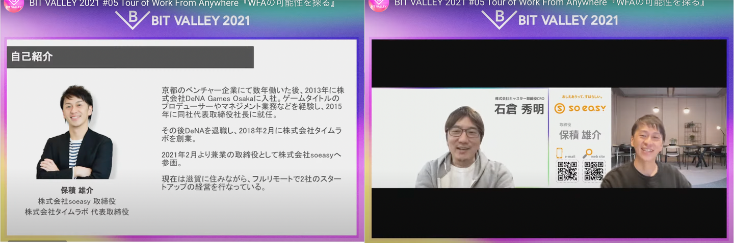 10/27(水) BITVALLEY運営委員会 主催(株式会社ミクシィ、GMOインターネット株式会社、株式会社ディー・エヌ・エー、株式会社サイバーエージェント)「BIT VALLEY 2021 #05 Tour of Work From Anywhere『WFAの可能性を探る』」へ、株式会社soeasy取締役 保積雄介が登壇いたしました。