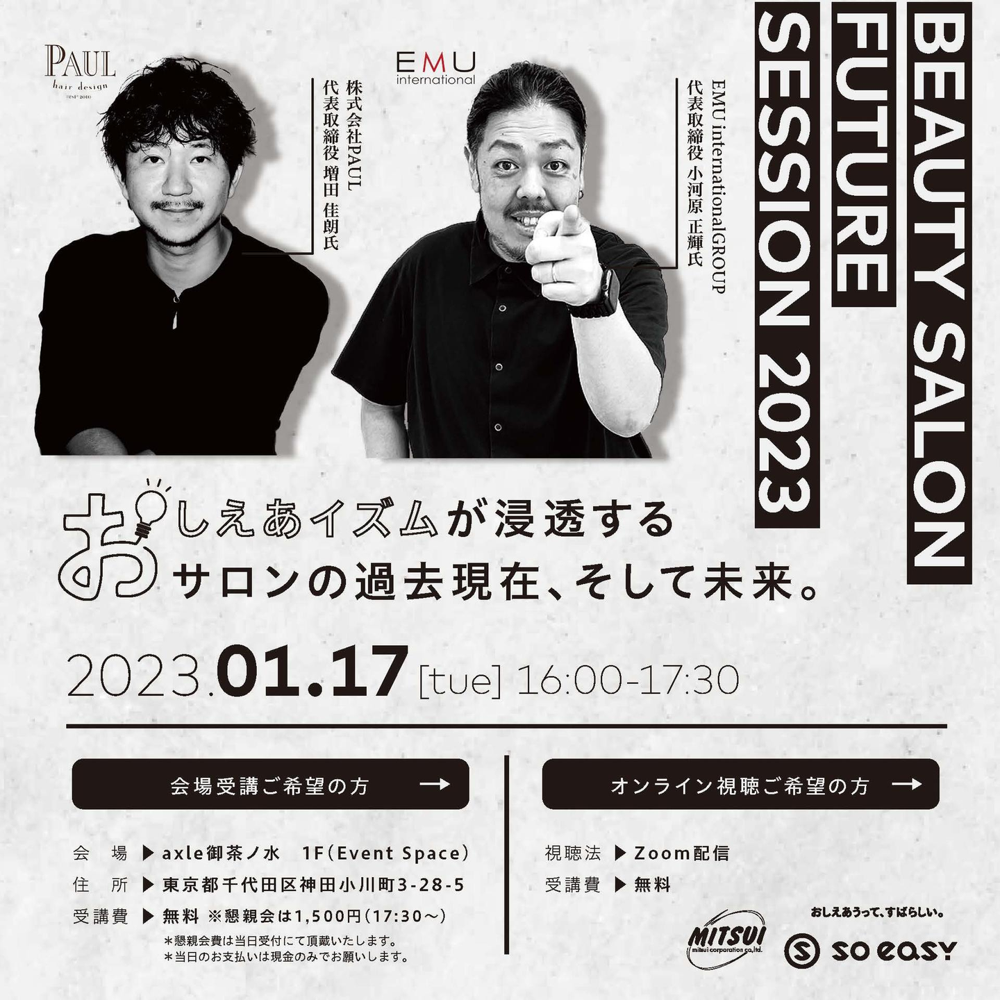 「おしえあうって、すばらしい。」を経営理念に掲げるsoeasyが展開するsoeasy buddy for beautyを介してつながった、業界課題に立ち向かい活動するキーマンたちをゲストにお招きし、サービス活用の事例や、共通テーマでのトークセッションを通じ、サロンの未来をともに語らうセッション、BEAUTY SALON FUTURE SESSION 2023が始動します。 ...