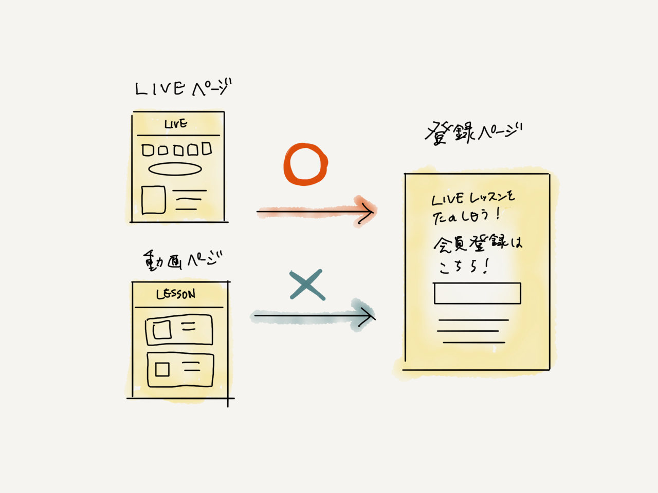 ここで問題が発生します。LIVEレッスンを訴求することを考えて画面をデザインしましたが、SOELUの会員登録画面はレッスン動画の画面からも動線が張られています。このまま会員登録画面をリリースすると、レッスン動画を目当てにアクセスしてきた人にもLIVEレッスンを訴求する画面を見せてしまうことになります。結局、レッスン動画を訴求するデザインをもう1つつくり、遷移動線によって内容を切り替えることにしました。