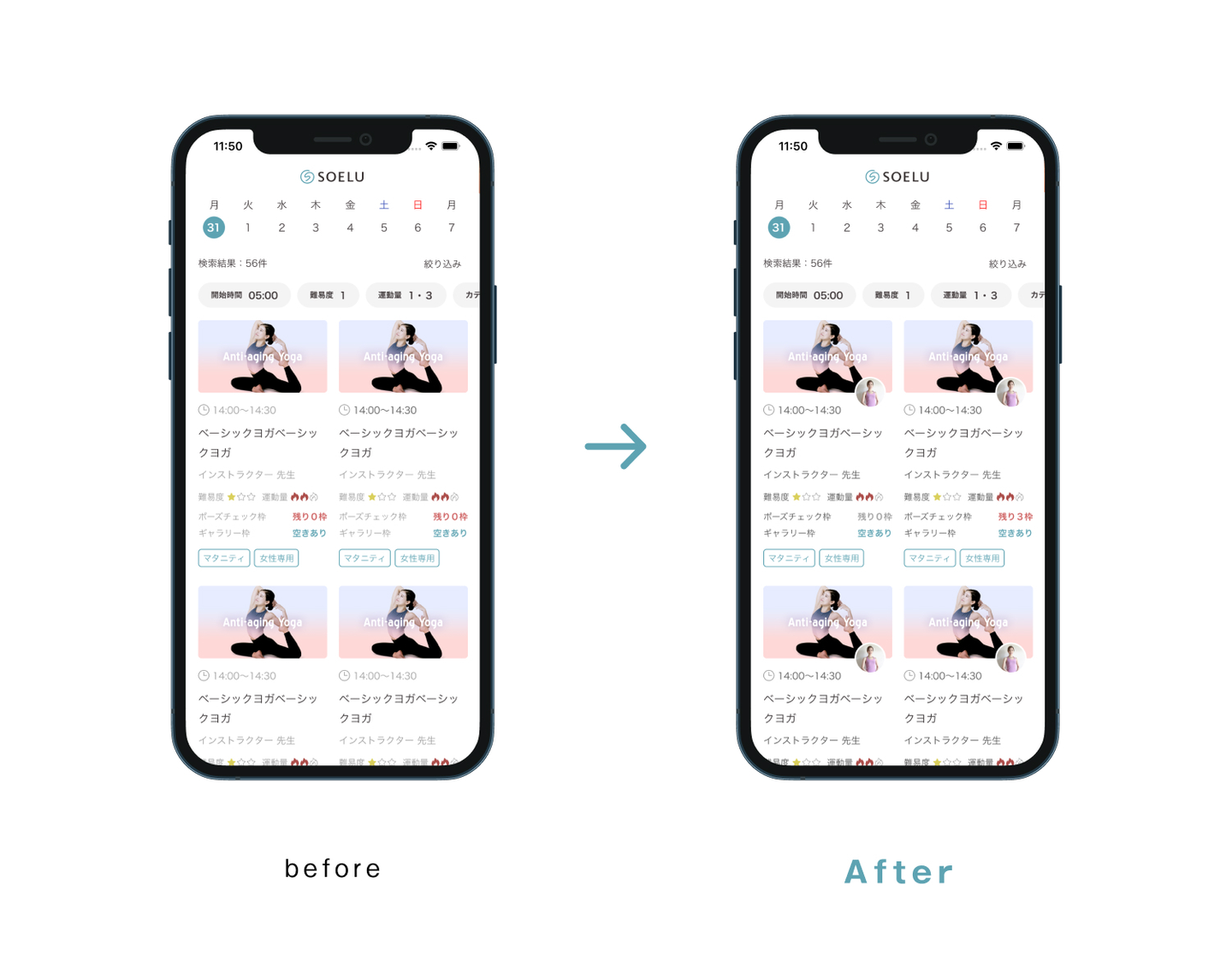このページは、実際にユーザーさんがレッスンを予約する際に使う「レッスン一覧ページ」です。SOELUでは毎日150レッスン以上を開講しているため、これまでもレッスンの検索機能のアップデートなどを行ってきていました。