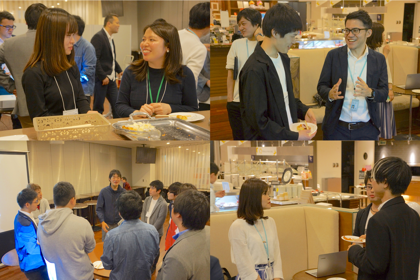 軽食を片手に、エンジニアと企画系のグループに分かれ懇親会を開催。直接話しが聞ける機会として大いに話が盛り上がる時間となりました!