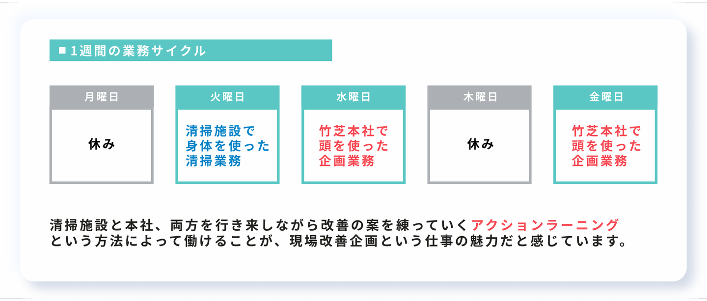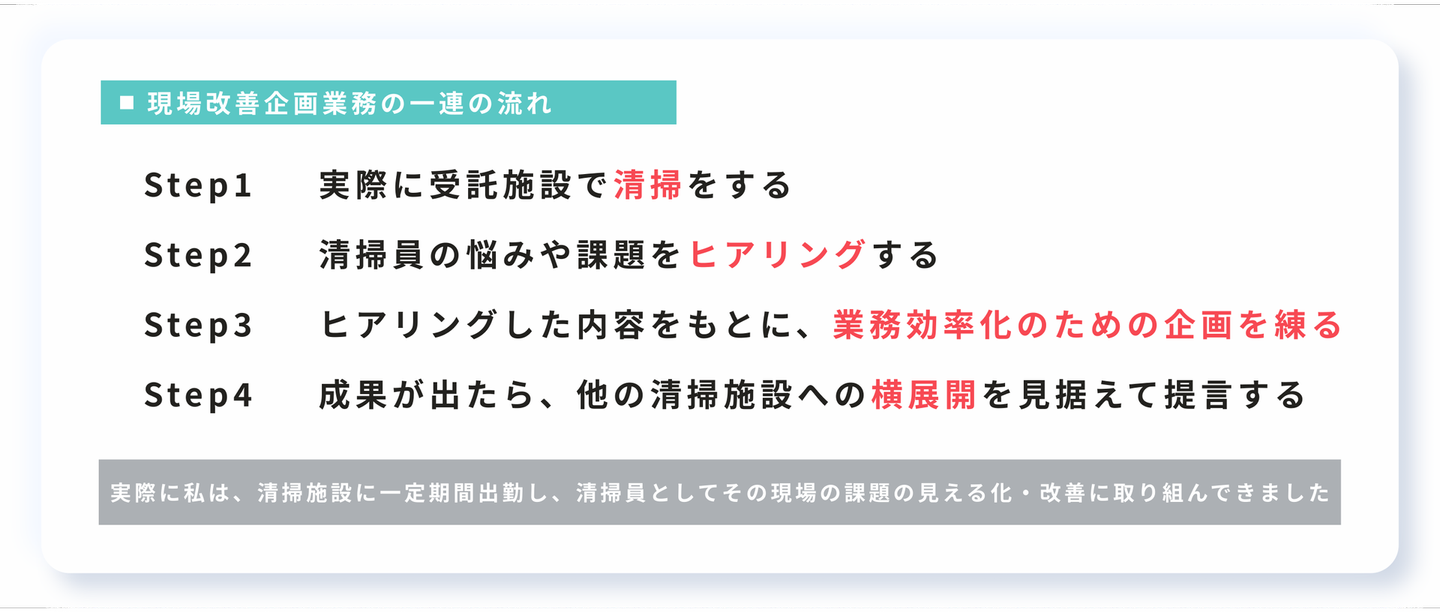 しかし、これまで生の声にとことんこだわって行動してきた私は、「実際に清掃施設を見てみたい!」と提案し、身体と頭の両方を使う働き方を自ら選択したことで、「現場改善企画職」が誕生しました。