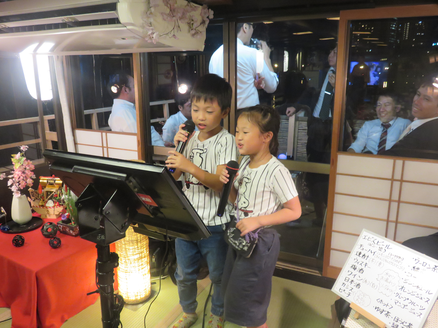 一方↓の船では、経営管理部の山羽正洋がお子さんと乾杯にチャレンジ。