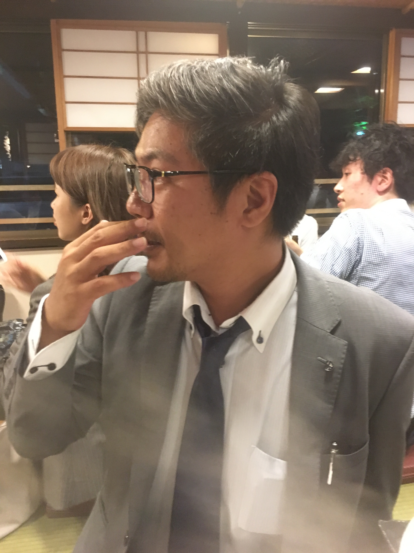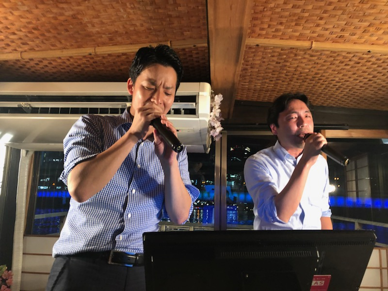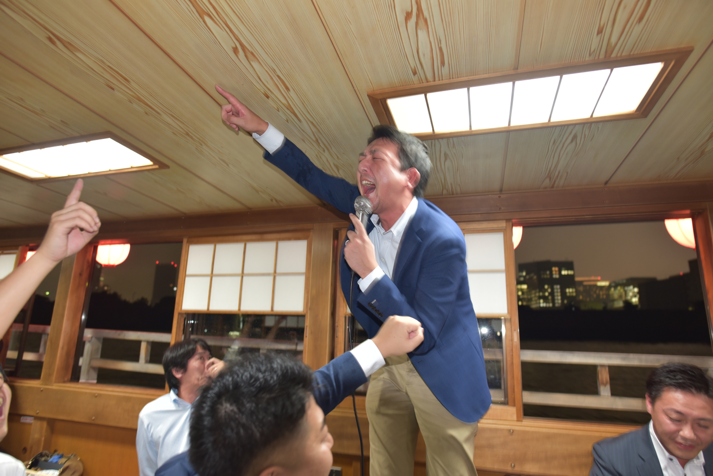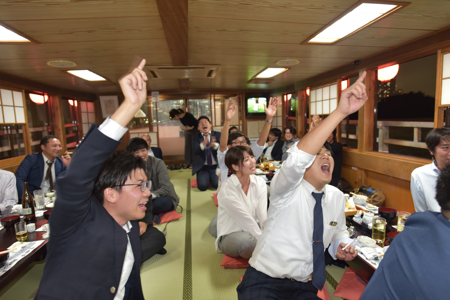 ↑の船では司会を担当した開発部門の小松伸和も、乾杯の挨拶を担当した執行役員の小田健太も頭が天井に。