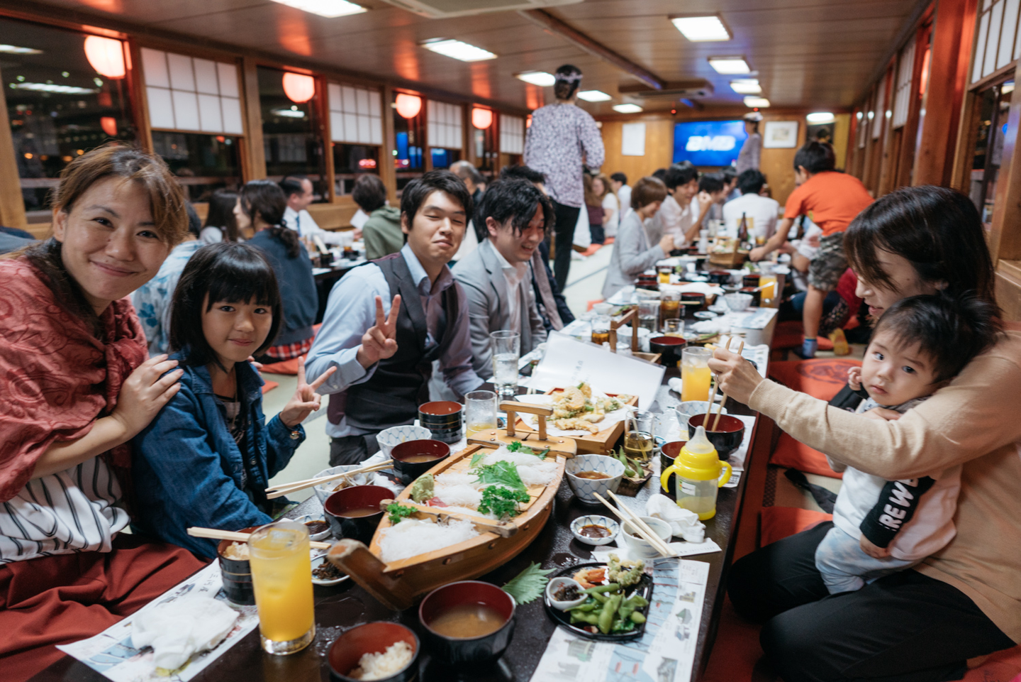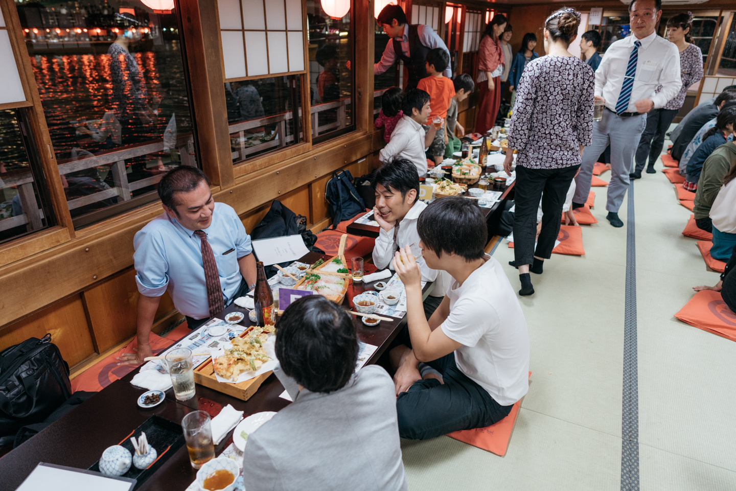 今回、屋形船を2隻チャーターすることから、片方の船は盛り上がるのが好きなメンバーを多めに、片方の船はお子さん連れのメンバーなどを中心に船を分けてみました。また、事前にアンケートを取り、それぞれ共通点を持ったメンバーが同じテーブルになるように工夫しました。
