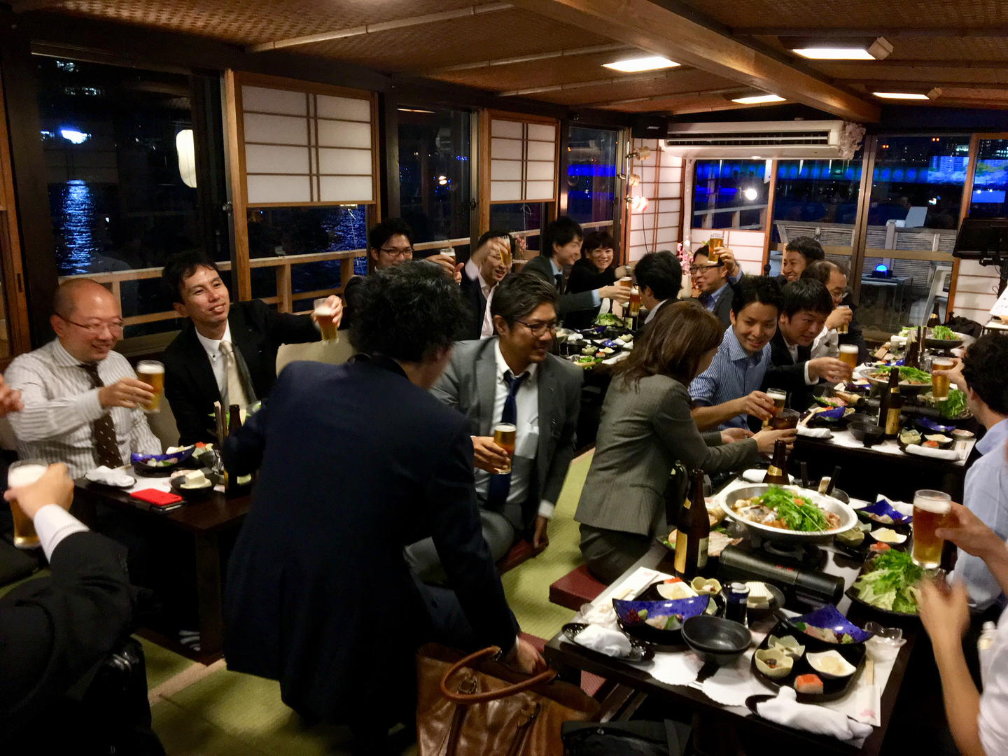 そもそもなんでeコミュで屋形船なのかというと、「屋形船という非日常的な空間で夜景や食事を楽しみ、いつもとは違う環境で仲良くなってもらおう」という目的があります。