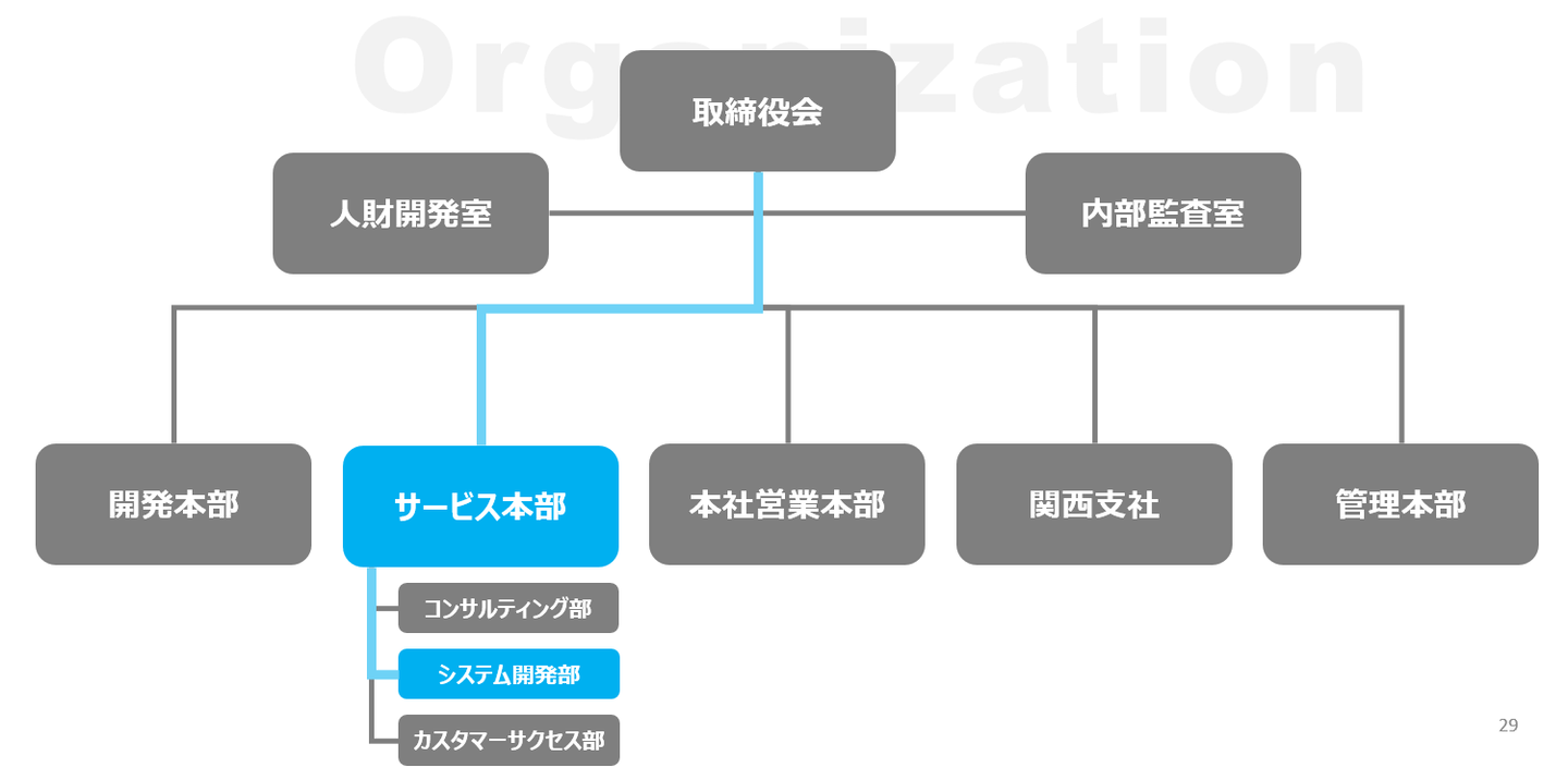 ソフトブレーンには、エンジニアのいる組織が2部門あります。1つは、製品パッケージを開発する「開発本部の製品開発部」。もう1つは、顧客接点がある「サービス本部のシステム開発部」となります。