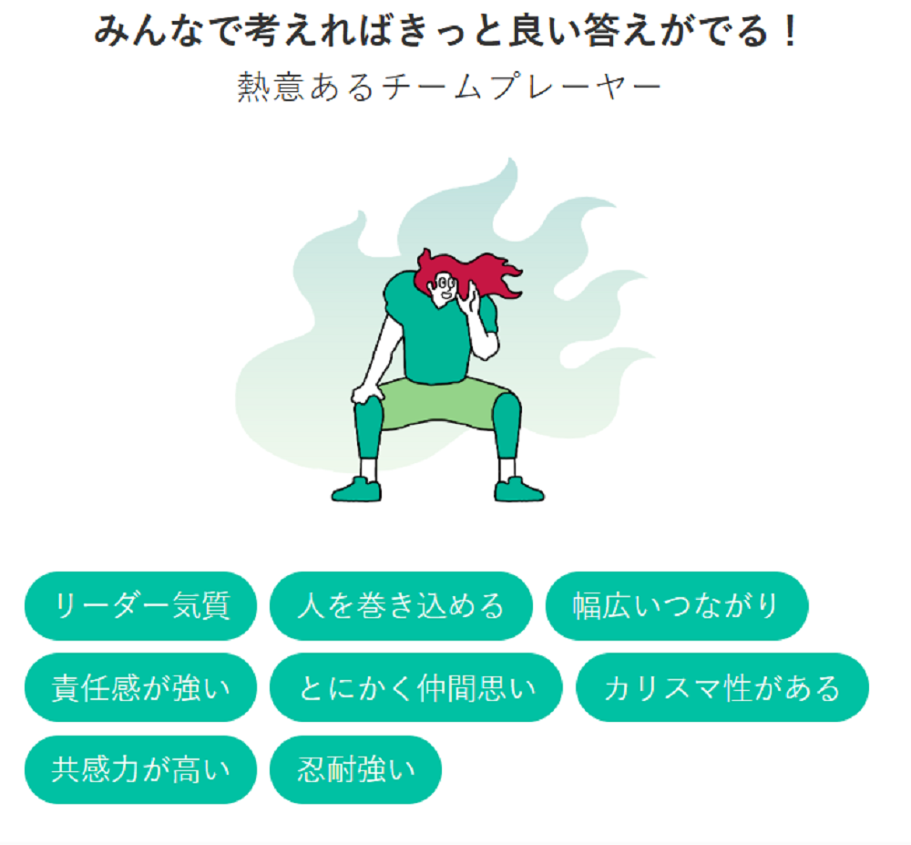 第三位は熱意あるチームプレーヤー。こちらも社内には5人と、人や周りを巻き込んで業務を推進していく力を個性とするメンバーがいる事が、ソーラーパートナーズにとっては心強いです。このキャラクターを持つメンバーは、それぞれの個性を尊重しながら助言や励ましをしてチームを前進させている人が多い印象です。そして何よりも明るい!チームにはなくてはならない存在です。