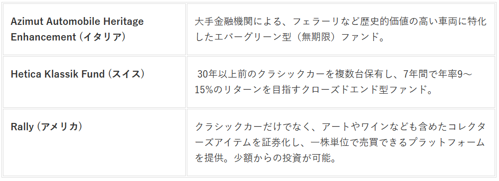 欧州ではクラシックカー投資がより盛んで、様々なファンドが組成されています。